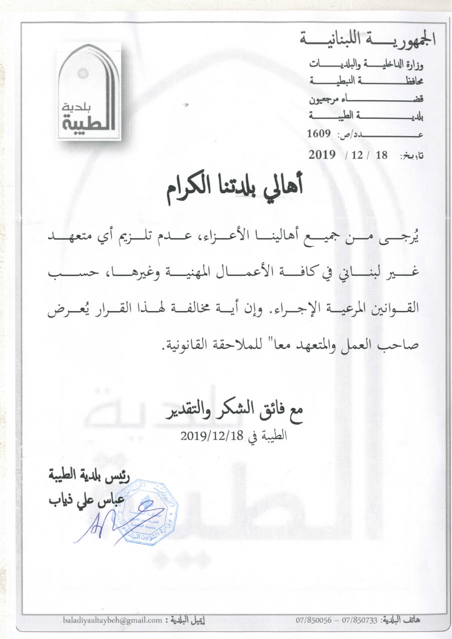 يُرجى من جميع أهالينا الأعزاء، عدم تلزيم أي متعهد غير لبناني في كافة الأعمال المهنية وغيرها، حسب القوانين المرعية الإجراء. وإن أية مخالفة لهذا القرار يُعرض صاحب العمل والمتعهد معا" للملاحقة القانونية.
