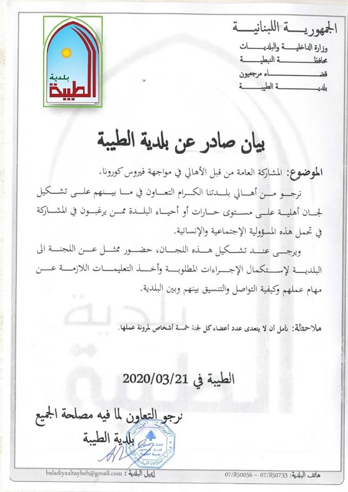 بيان بلدية الطيبة حول المشاركة العامة من قبل الاهالي في مواجهة فيروس كورونا