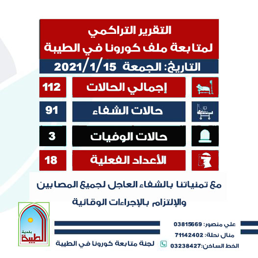 التقرير التراكمي لمتابعة ملف كورونا في الطيبة حتى تاريخ اليوم الجمعة ١٥/١/٢٠٢١: اجمالي اعداد المصابين من اول الازمة ١١٢/ حالات الشفاء :٩١/متابعة(فعلي):١٨/وفاة:٣
